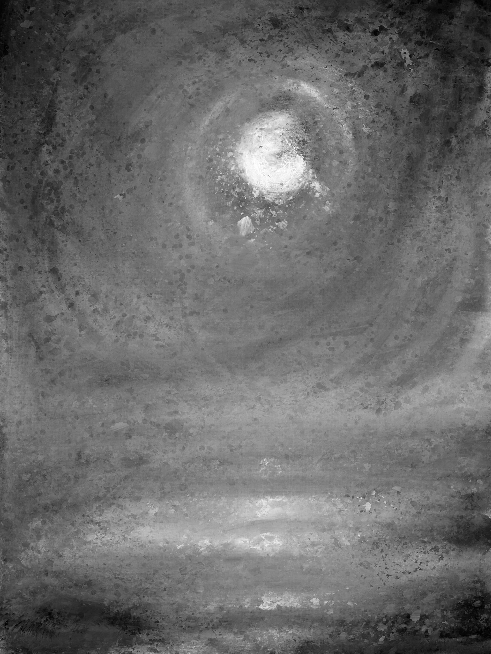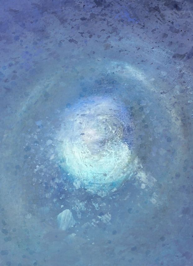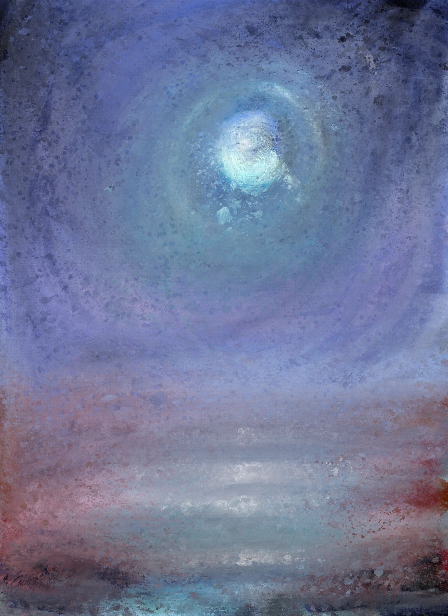 A single celestial body ringed by a halo of ice-blue set against a vast field of ultramarine and violet stippled like a night atmosphere seen through cold glass. The lower register shifts to mauve and terracotta, resolving into a horizontal band of pale silver that suggests either a horizon line, a frozen sea, or the last memory of day.