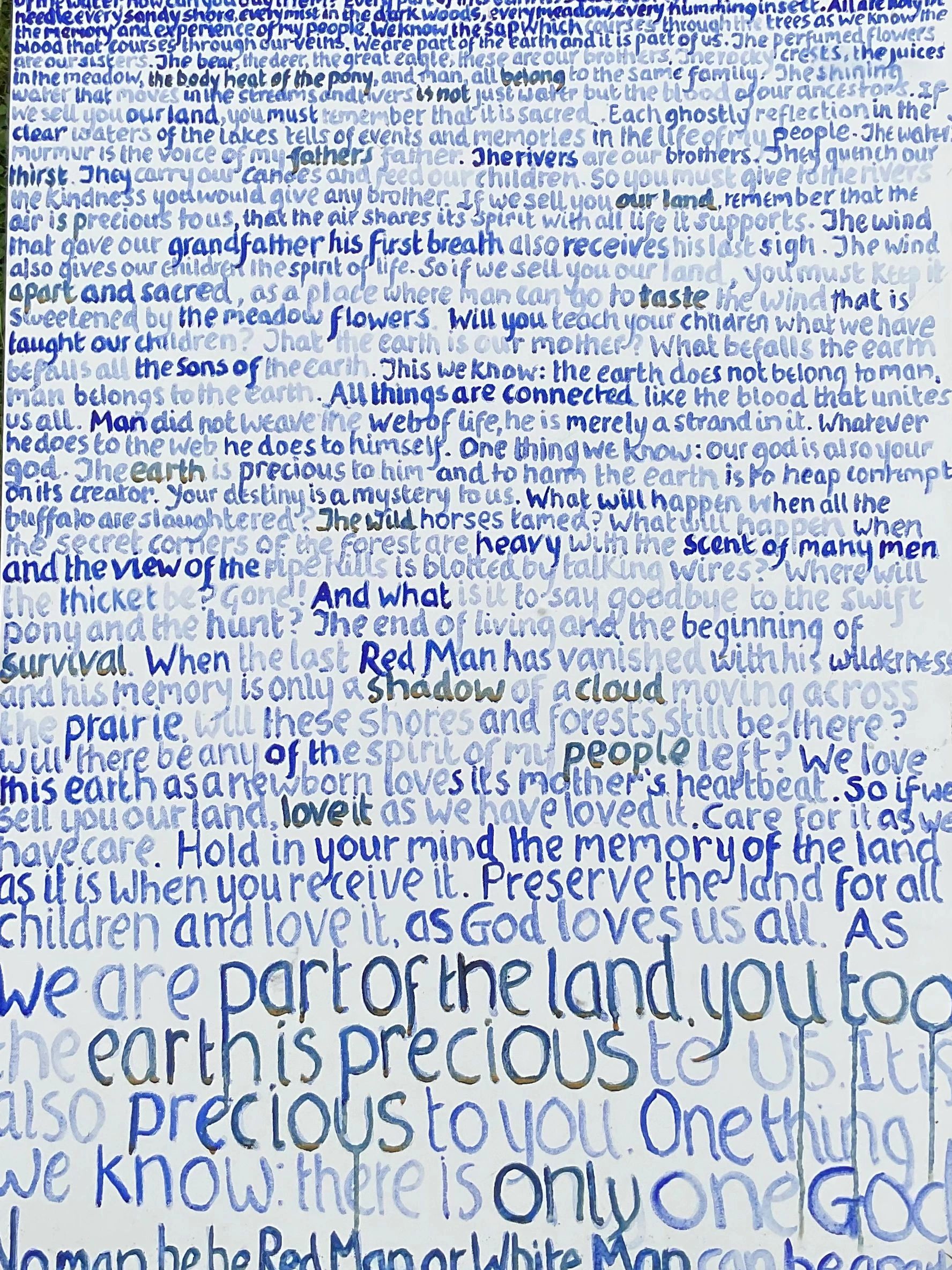A remarkable work that operates simultaneously as visual art, calligraphic performance, and political meditation. The entire surface is covered with handwritten text in varying blues — from pale sky to deep indigo — reproducing Chief Seattle’s celebrated address on the relationship between humanity and the natural world. The text begins in small, densely packed script at the top of the sheet and progressively enlarges as it descends, the letterforms growing bolder and more urgent until the final lines fill the page with monumental declarations. This typographic crescendo transforms a written document into a visual experience: the increasing scale mimics the rhetorical intensification of the speech itself, and the deepening blue registers as both sky and water — the very elements the text addresses. Key phrases are given additional weight through bold emphasis, creating rhythm and punctuation within the visual field. The work belongs to a tradition of text-based art that includes Jenny Holzer’s projections and Xu Bing’s calligraphic installations, but its handmade quality and the moral gravity of its source material give it a directness and emotional force that purely conceptual approaches rarely achieve.